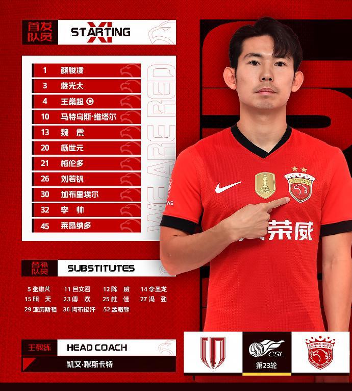 上海海港首发:1-颜骏凌、3-蒋光太、4-王燊超、13-魏震、32-李帅、10-马特乌斯-维塔尔(F)、20-杨世元、21-梅伦多(F)、26-刘若钒、30-加布里埃尔(F)、45-莱昂纳多(F)