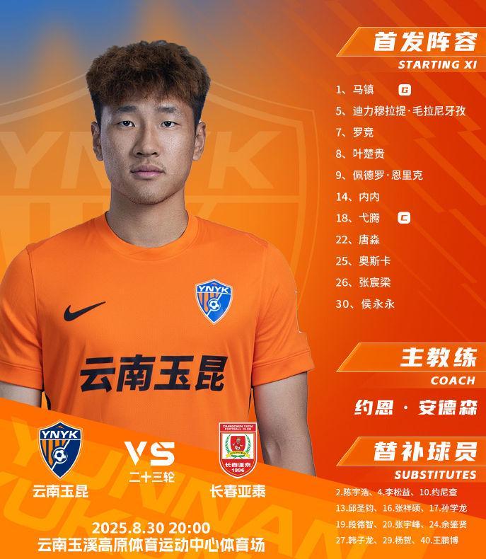 云南玉昆首发:1-马镇、5-迪力穆拉提、18-弋腾、22-唐淼、26-张宸梁、7-罗竞、8-叶楚贵、14-内内(F)、30-侯永永、9-佩德罗-恩里克(F)、25-奥斯卡(F)