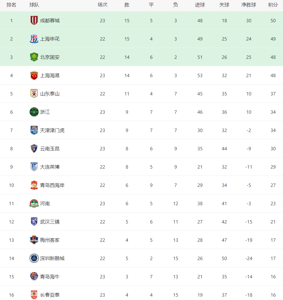成都蓉城积50分,多赛一轮超越上海申花、北京国安,登上榜首位置,卫冕冠军上海海港跌至第四。此外,长春亚泰积16分,继续排名垫底,错失逃离降级区的机会。