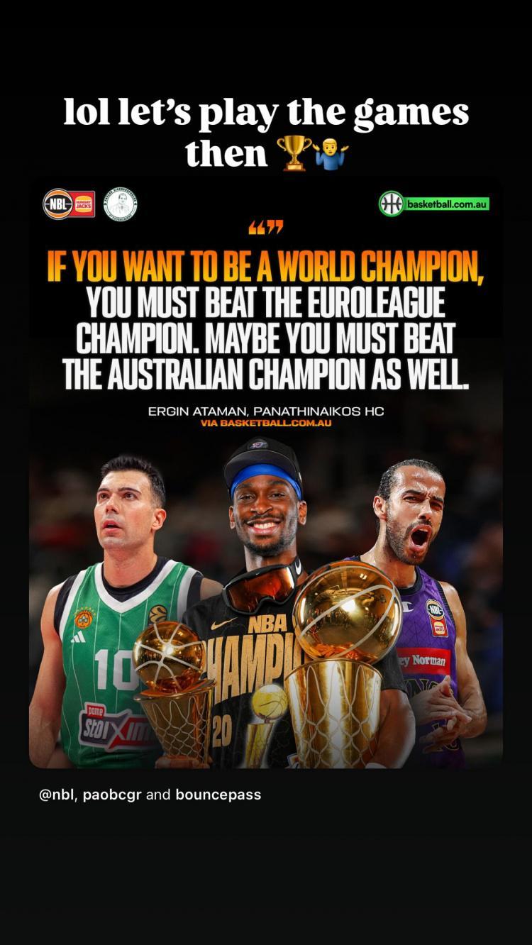 直播吧9月4日讯 此前,土耳其男篮、希腊豪门帕纳辛纳科斯队主帅埃尔金-阿塔曼曾表示NBA冠军想被称为世界冠军就必须击败欧洲联赛和澳洲联赛的冠军。对此,今年NBA总冠军雷霆队的老将卡鲁索在社媒发文给予了回应。